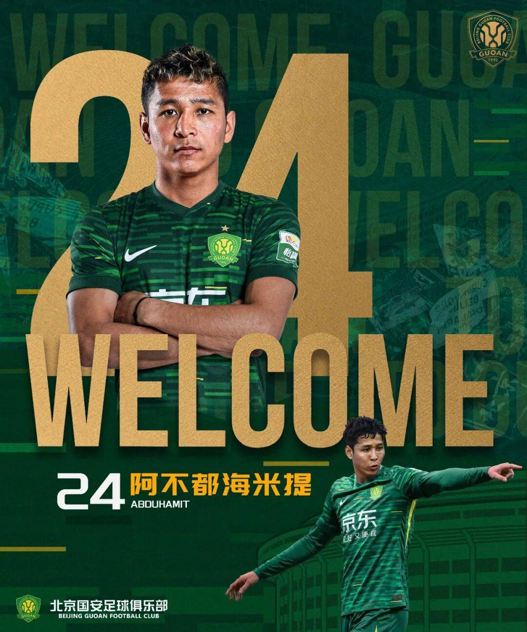 阿不都海米提·阿不都格尼正式加盟北京国安足球俱乐部,他将身披24号球衣,代表北京国安出战本赛季中超联赛、亚冠联赛、足协杯等各项赛事。